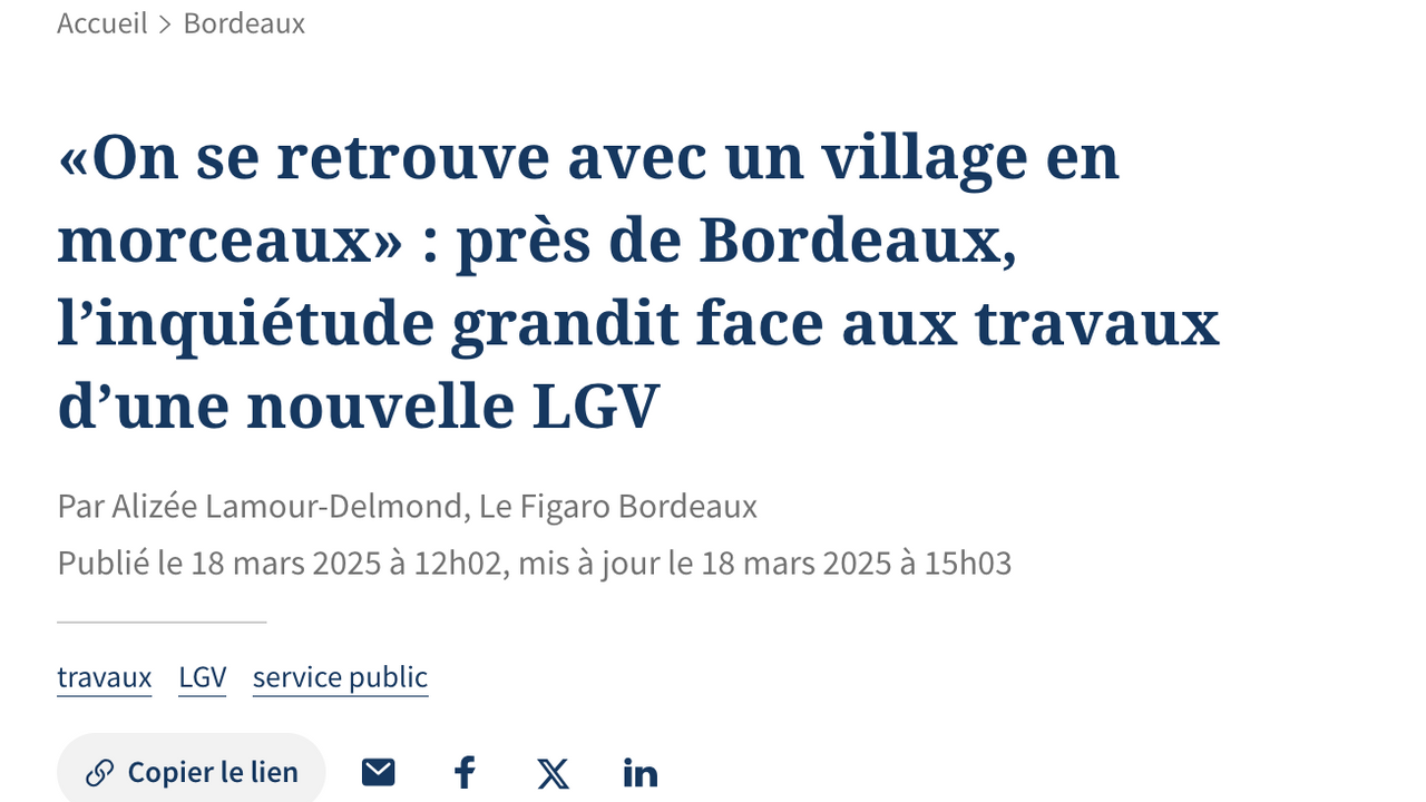 Le 18 mars 2025, le Figaro consacre un article sur le morcèlement du village de Saint-Médard d'Eyrans suite aux travaux concernant la LGV